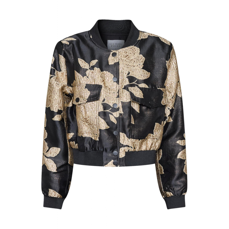 Deze stoere maar vrouwelijke zwarte bomber jacket van SisterS point is een toevoeging aan je garderobe. Met zijn opvallende bloemenpatroon in goud, brengt het ontwerp een vleugje luxe in elke outfit. De bomber heeft een comfortabele regular pasvorm en is gemaakt van 100% polyester. De handige klepzakken en drukknoopsluiting voegen een praktische touch toe, terwijl de ronde halslijn zorgt voor een moderne uitstraling.
