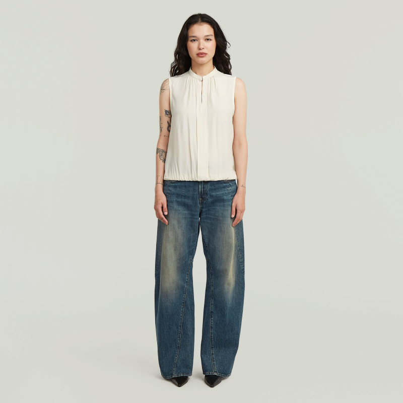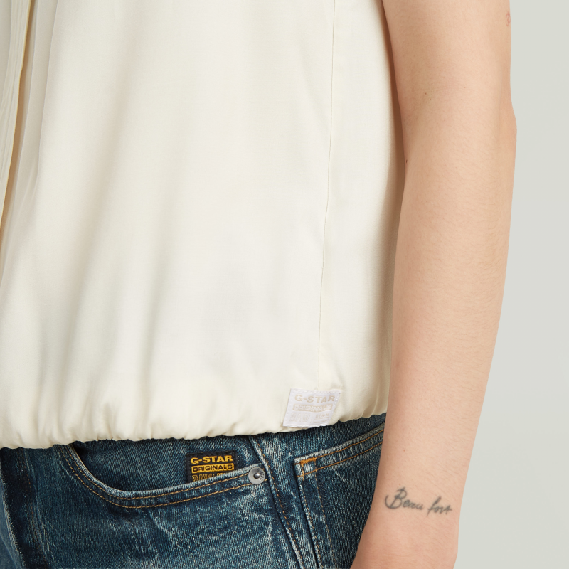 De G-star Stand Up Collar is een mouwloze top met een smalle boordkraag waar een split onder verwerkt is. De plooi aan de voorkant is vastgestikt en langs de hals is de naad aangerimpeld voor een licht plooiend effect.