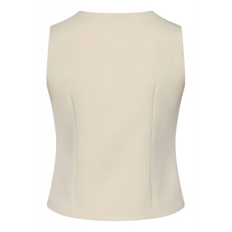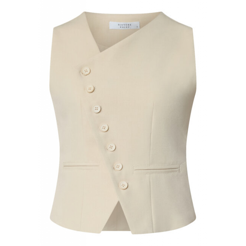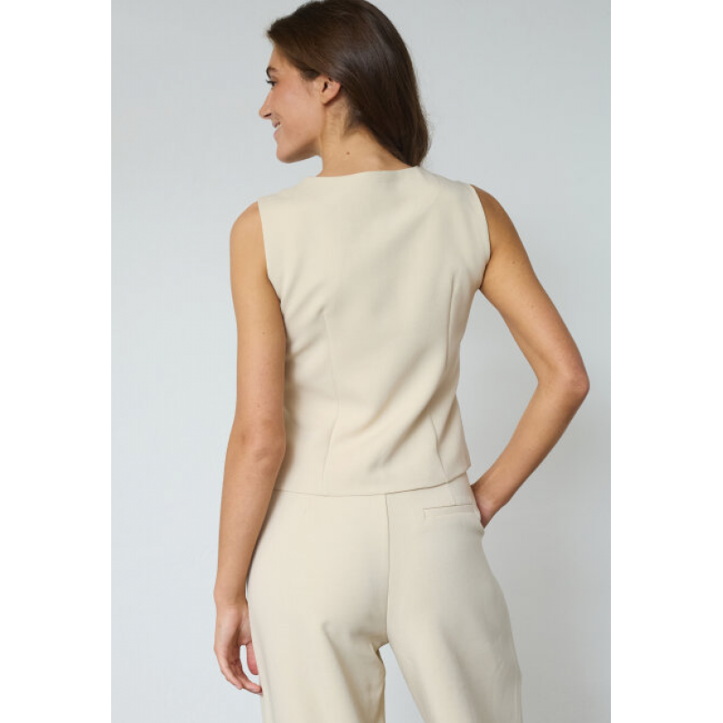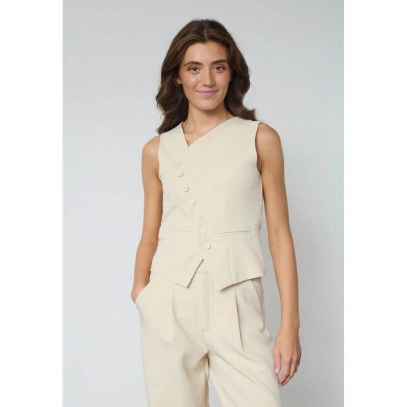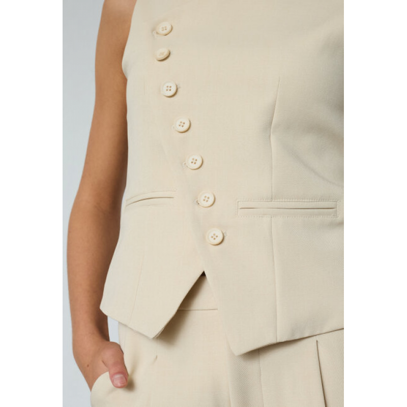 GATA-VE2 is een mouwloos vest met een asymmetrische halslijn. Het vest heeft een rij decoratieve knopen aan de voorkant en een getailleerde pasvorm voor een verfijnde uitstraling.