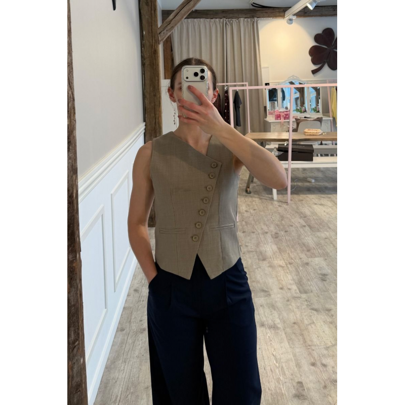 GATA-VE2 is een mouwloos vest met een asymmetrische halslijn. Het vest heeft een rij decoratieve knopen aan de voorkant en een getailleerde pasvorm voor een verfijnde uitstraling.