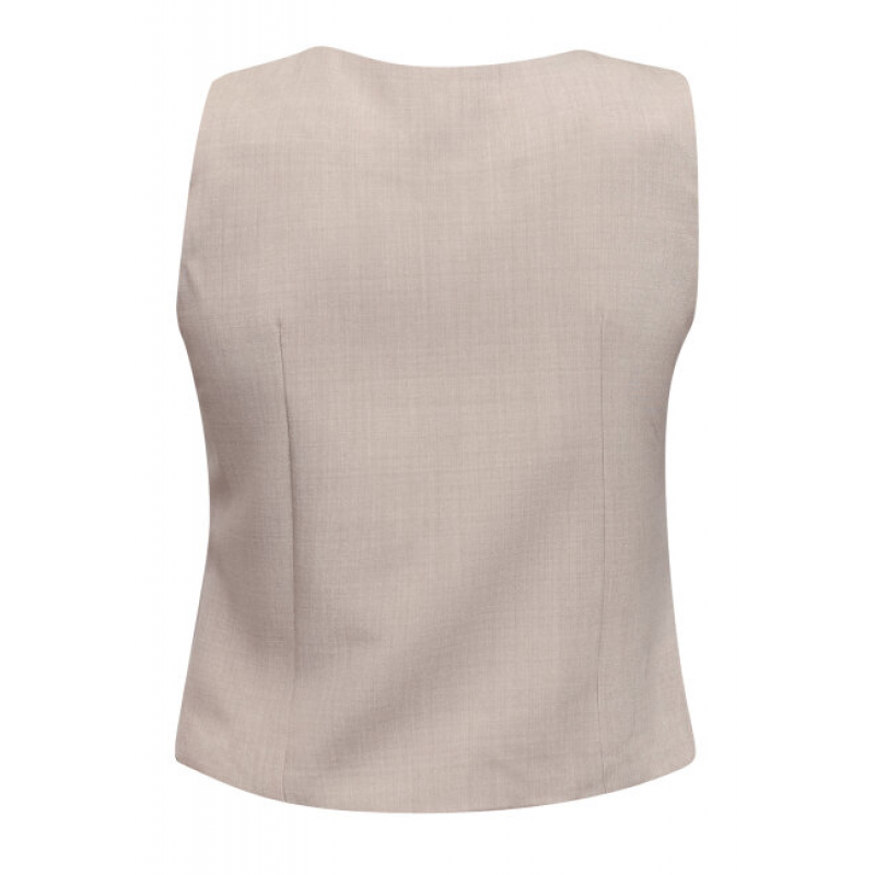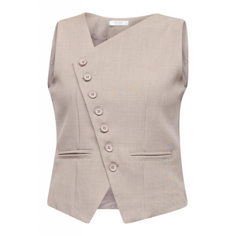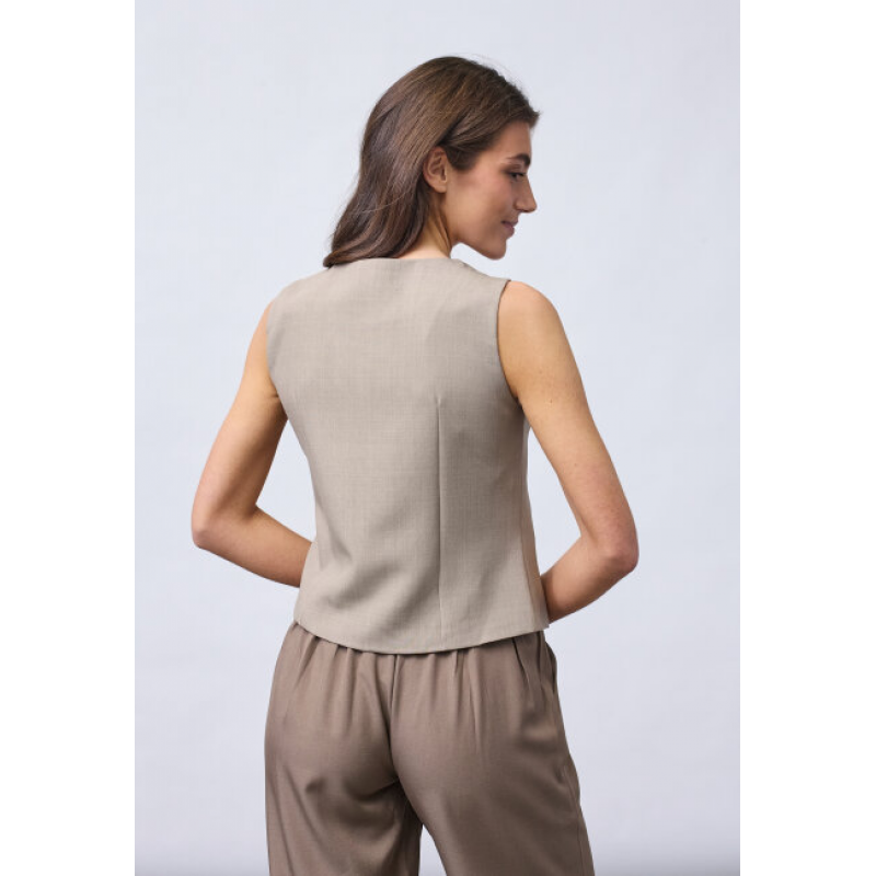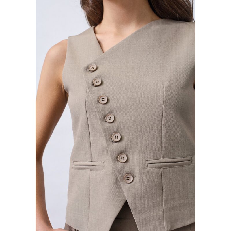 GATA-VE2 is een mouwloos vest met een asymmetrische halslijn. Het vest heeft een rij decoratieve knopen aan de voorkant en een getailleerde pasvorm voor een verfijnde uitstraling.