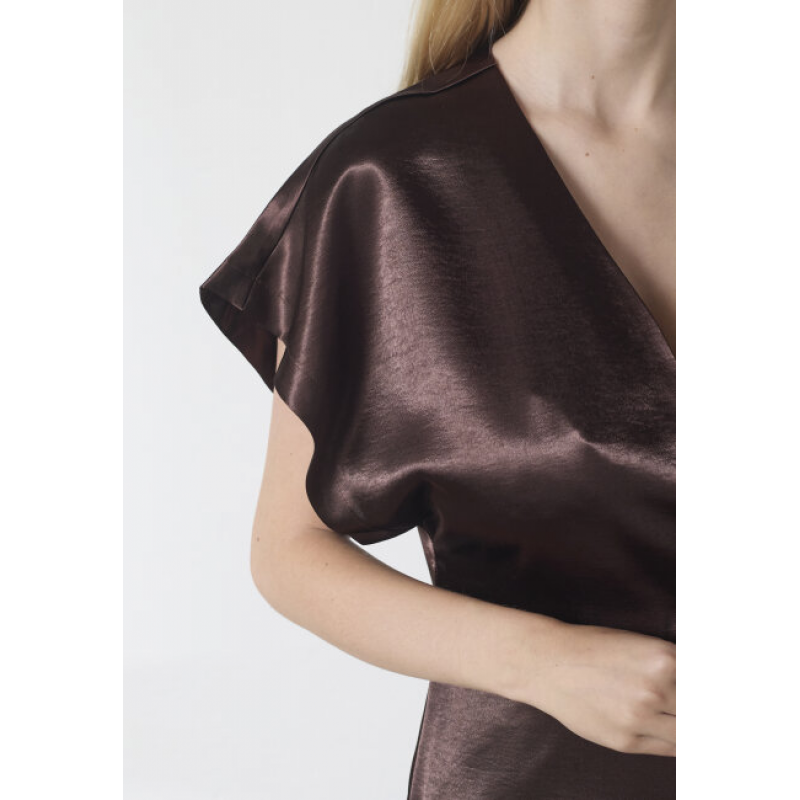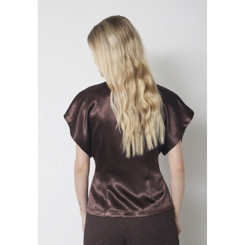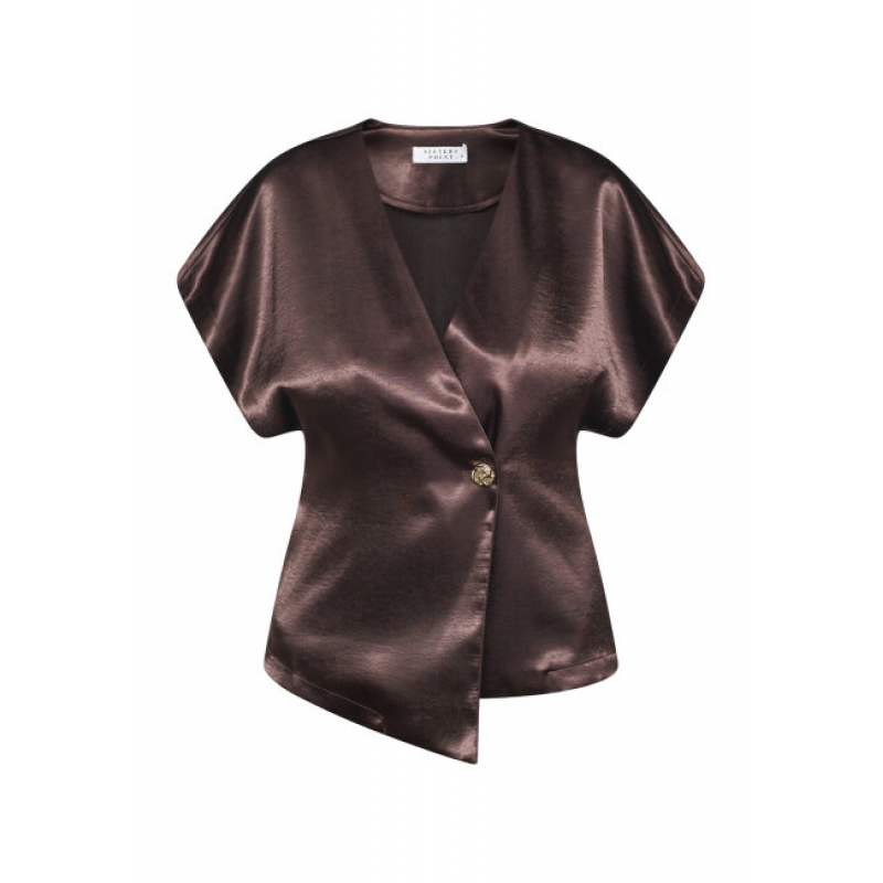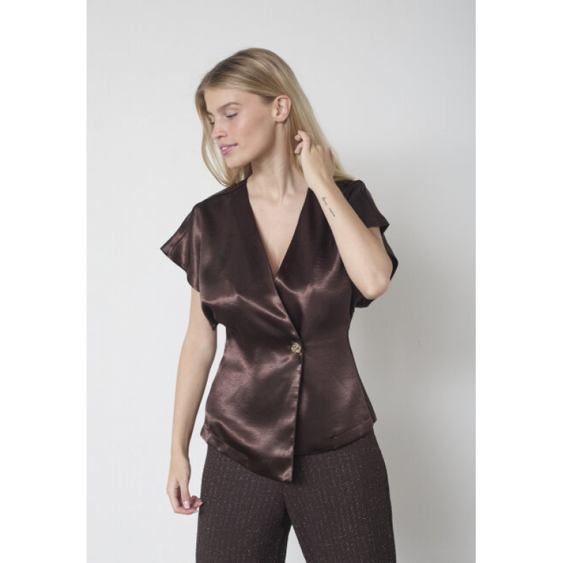 De Gevela top van Sisterspoint is een gilet met korte mouwen, een diepe V-hals en een asymmetrische sluiting aan de zijkant met een enkele knoop. Hij heeft licht gemarkeerde schouders en een getailleerd silhouet.